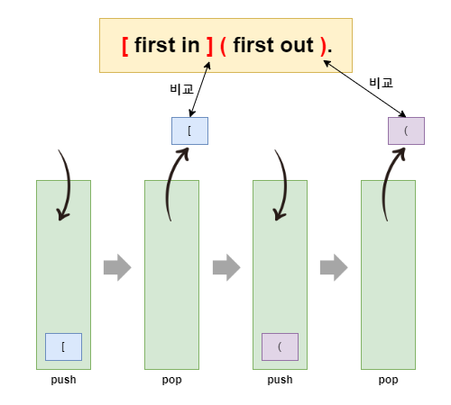 - 닫는 괄호가 나오면 스택에서 마지막으로 열린 괄호를 팝하여 짝이 맞는지 확인함. 짝이 맞지 않으면 반복문을 종료함.
