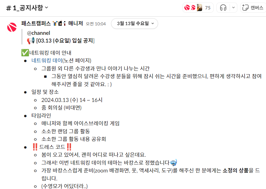네트워킹 데이에 대한 자세한 내용은 슬랙 공지를 통해 알게 되었는데요. 매니저님이 올려주신 공지를 보고 어떤 방식으로 진행되는지 알 수 있었습니다.