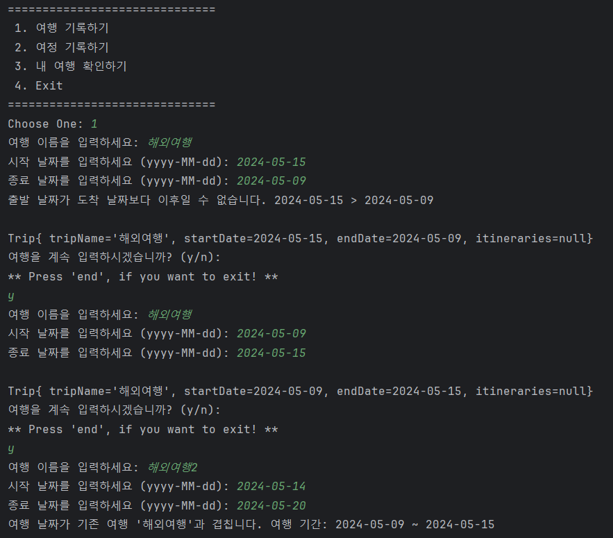 이 요청을 받았을 때, 아래와 같이 writeTrip() 메소드에 try-catch 문에서 InvalidDateOrderException으로 에러 메시지를 던짐. InvalidDateOrderException은 날짜 순서가 유효하지 않을 때 발생하는 예외임. 여행의 출발 날짜가 도착 날짜보다 뒤에 있을 경우 이 예외를 발생시키도록 할 수 있음.