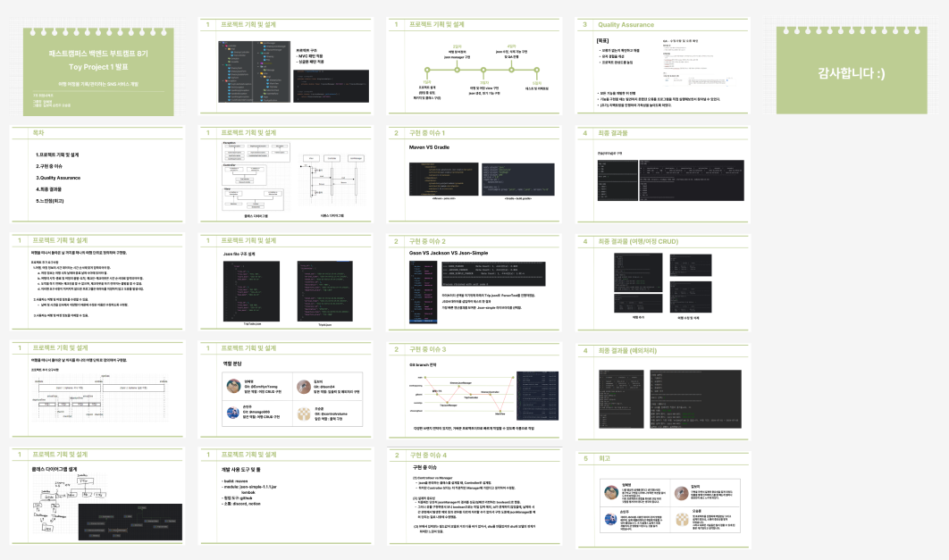 - 처음 이 프로젝트를 시작했을 때, 내가 과연 이 모든 것을 해낼 수 있을까 하는 의구심을 가지고 있었음. 앞으로 더 많은 프로젝트가 나를 기다리고 있겠지만, 포기하지 않고 열심히 하겠음. 다음 프로젝트가 시작되기 전까지 스프링에 대해서 꼭 미리 학습할 것임.