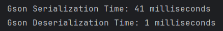 System.out.println("Gson Serialization Time: " + (endTime - startTime) / 1000000 + " milliseconds");