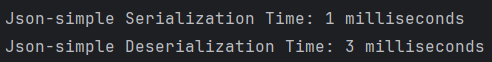 System.out.println("Json-simple Serialization Time: " + (endTime - startTime) / 1000000 + " milliseconds");