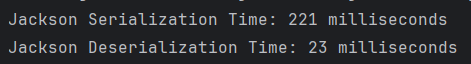 System.out.println("Jackson Serialization Time: " + (endTime - startTime) / 1000000 + " milliseconds");