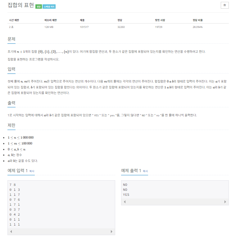 초기에 $n+1$개의 집합 $\{0\}, \{1\}, \{2\}, \dots , \{n\}$이 있다. 여기에 합집합 연산과, 두 원소가 같은 집합에 포함되어 있는지를 확인하는 연산을 수행하려고 한다. 집합을 표현하는 프로그램을 작