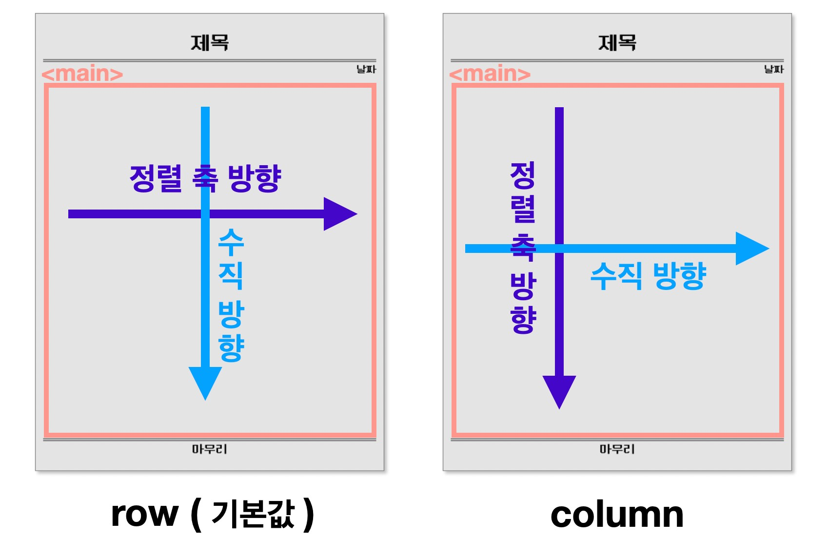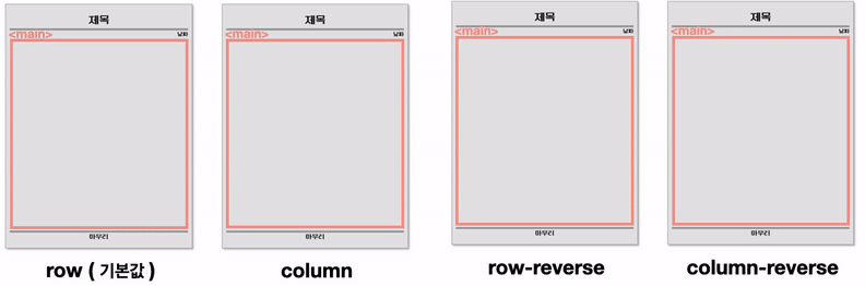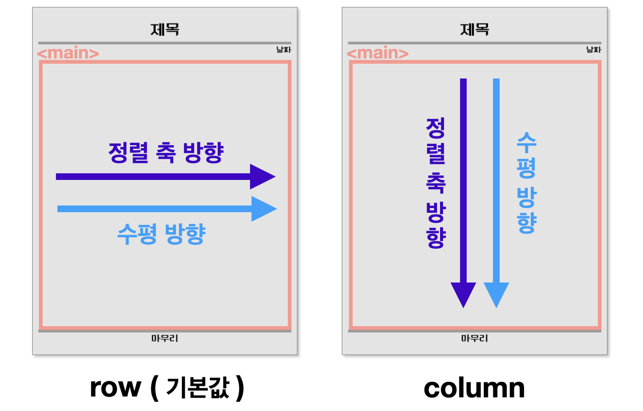 : 부모 요소에 설정해 주는 속성으로, 자식 요소들을 정렬할 정렬 축을 정함. 아무 설정도 해주지 않으면 기본적으로 가로 정렬을 함.