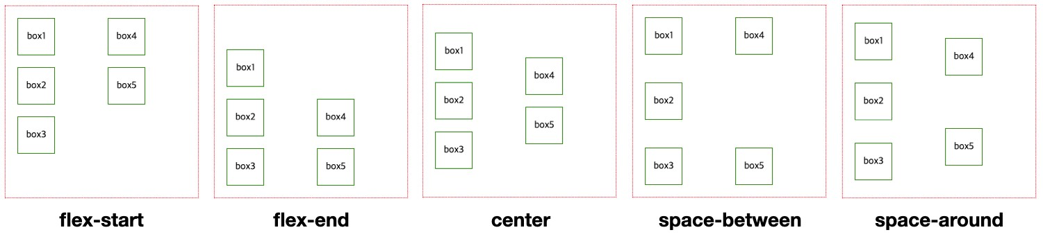 주요 속성값으로는 flex-start , flex-end, center, space-between, space-around이 있음. 각 속성값의 특성이 잘 드러날 수 있도록 자식 요소의 크기를 동일하게 설정해 놓음.