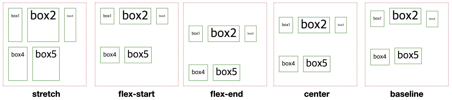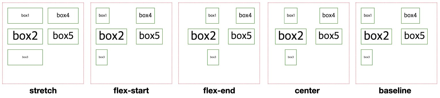 : 자식 요소들을 축의 수직 방향으로 어떻게 정렬할 것인지 정함. 요소들이 가로로 정렬되어 있다면 세로 방향으론 어떻게 정렬할 것인지, 세로로 정렬되어 있다면 가로 방향으론 어떻게 정렬할 것인지 정하는 속성임.