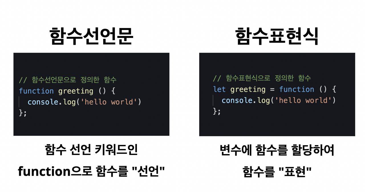 - 함수표현식: 함수 선언 키워드가 아닌 변수 선언 키워드를 사용하여 함수를 ‘표현’한 방식