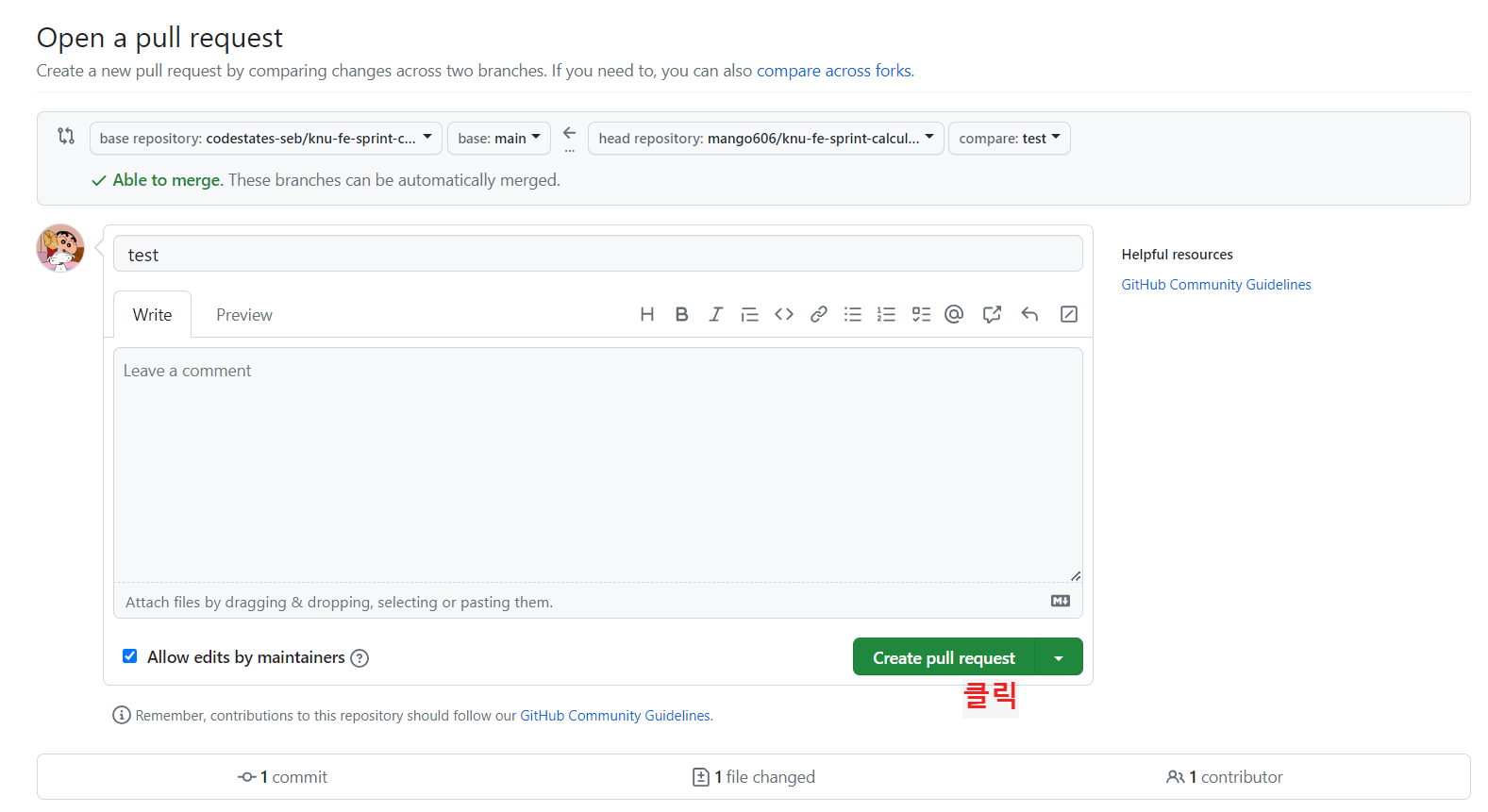 작성하고 싶은 메시지를 입력하고 Create pull request 버튼을 클릭하면 pull request가 완료되어 과제가 제출됨.