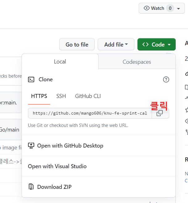 fork로 생성한 자신의 저장소의 url을 복사함. 상단의 주소를 복사하지 말고 Code 버튼을 클릭하여 HTTPS 주소를 복사하도록 함.
