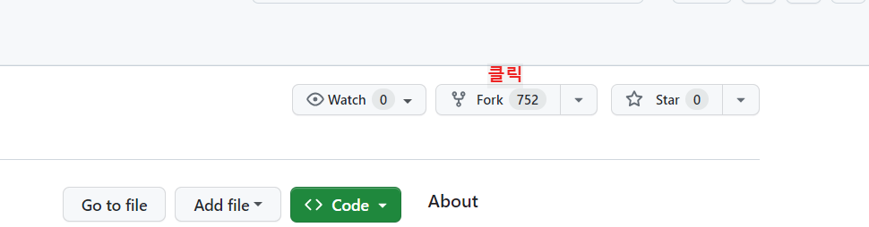 원본 저장소(레포지토리) 오른쪽 상단을 확인하면 fork 버튼이 있음. 클릭해서 자신의 저장소로 fork 함.