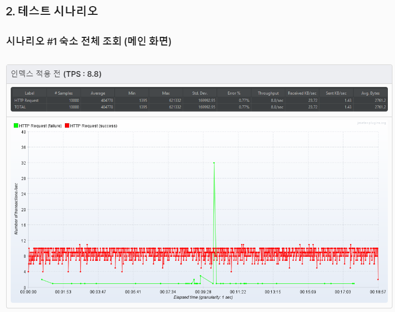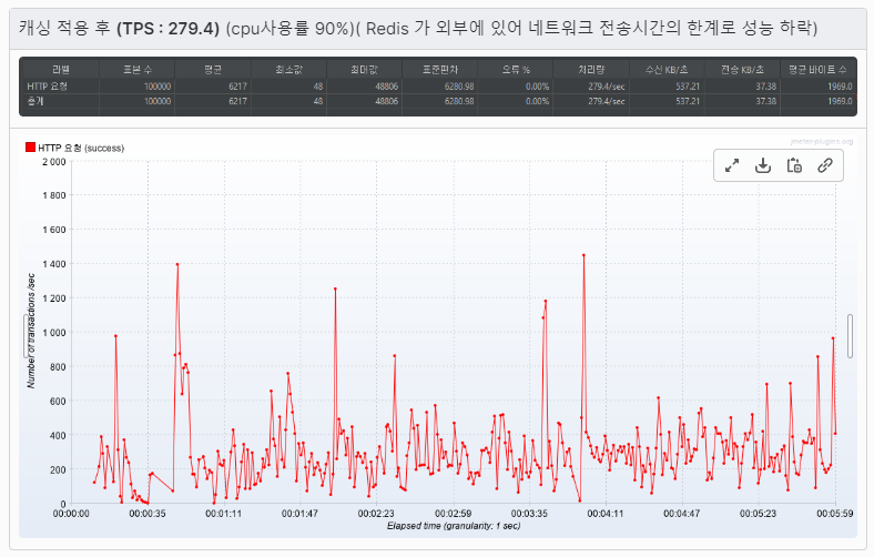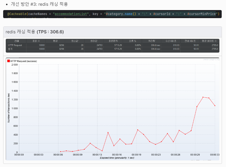 - 조회 부하 테스트를 진행함. TPS를 증가시키기 위해 패치 조인, 캐싱 등을 적용함.