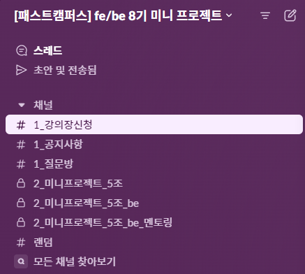 미니 프로젝트가 시작되면서 프론트엔드와 slack와 zep에서 소통을 할 수 있게 되었음. zoom 회의실에서 인사 후 대부분의 작업은 slack과 zep에서 진행됨.
