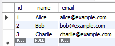 INSERT INTO customers_innodb (name, email) VALUES ('Charlie', 'charlie@example.com');