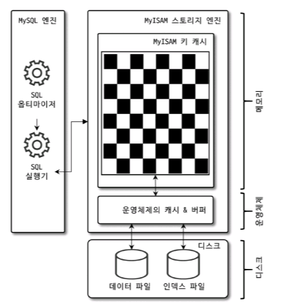- MyISAM 테이블의 데이터 읽기나 쓰기 작업은 항상 운영체제의 디스크 읽기 또는 쓰기 작업으로 요청될 수밖에 없음.