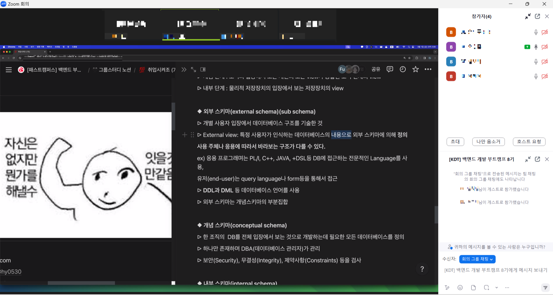 그룹 스터디 초기에는 CS 공부를 하기로 정했기 때문에, 관련 지식을 공부해서 스터디를 했었습니다. 각자 학습하는 과목 및 분야가 달라서 매주 새로운 내용을 배울 수 있는 유익한 시간이었습니다. 잘 모르는 것은 질문하고, 질문에 대해 대답하지 못해도 추가적으로 찾아보면서 공부할 수 있어 도움이 많이 되었습니다.