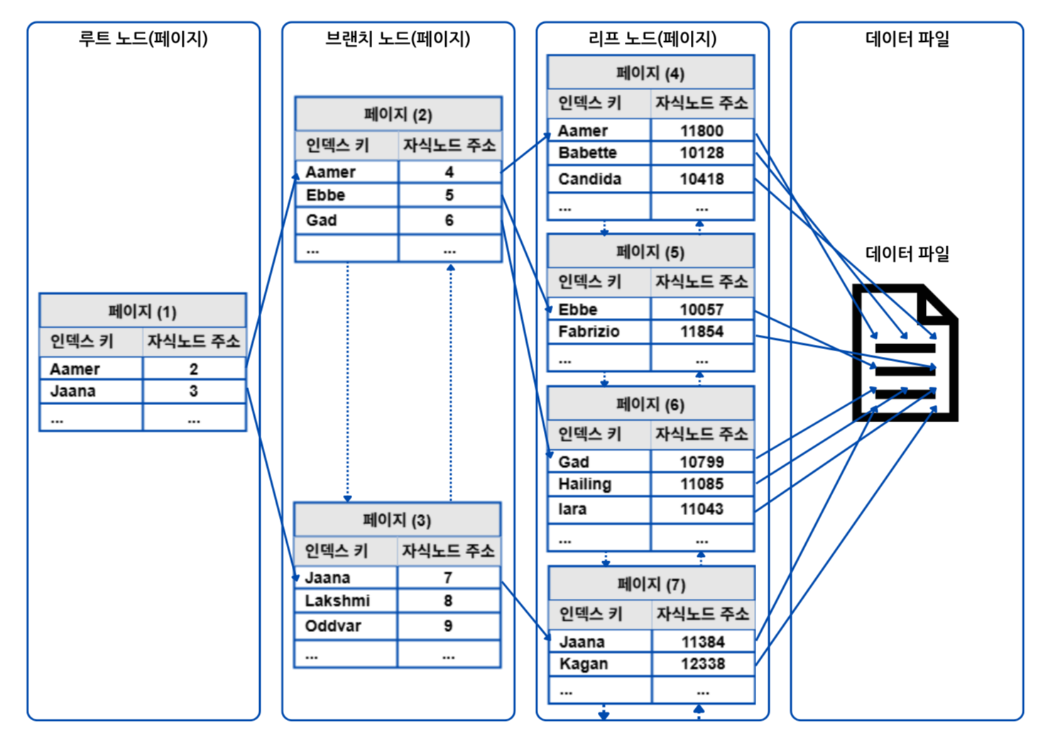 - 인덱스의 리프 노드는 항상 데이터 파일에 저장된 레코드의 주소를 가지고 있음.