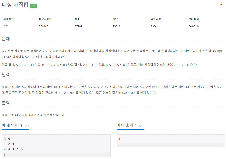 이 문제는 집합 자료구조와 대칭 차 연산의 활용법을 이해하는 데 적합한 문제입니다. 특히, 두 집합 간의 공통되지 않은 요소를 빠르게 계산할 수 있다는 점에서 `set`의 강력함을 느낄 수 있었습니다. 대칭 차 연산은 간단한 문제처럼 보이지만, 실전에서 데이터 비교나 필터링에 유용하게 쓰일 수 있다는 점을 깨달았습니다.