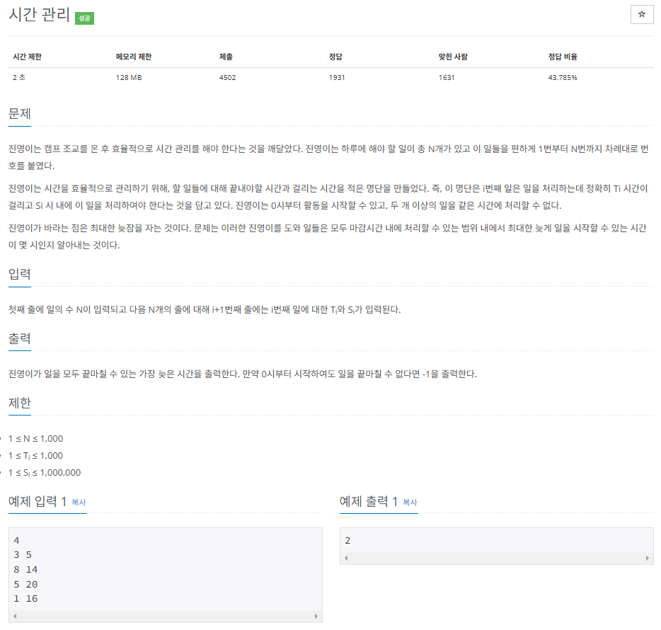 주어진 작업의 소요 시간과 마감 시간을 기반으로 모든 작업을 수행할 수 있는 가장 늦은 시작 시간을 계산하는 문제임. 각 작업은 소요 시간과 마감 시간이 주어지며, 모든 작업을 마감 시간 내에 끝낼 수 있는지를 판단함.