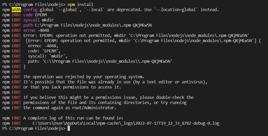 1) comclothing.log, "npm WARN config global `--global`, `--local` are deprecated. Use `--location=global` instead. 해결", 2022.06.04, npm WARN config global `--global`, `--local` are deprecated. Use `--location=global` instead. 해결 (velog.io)