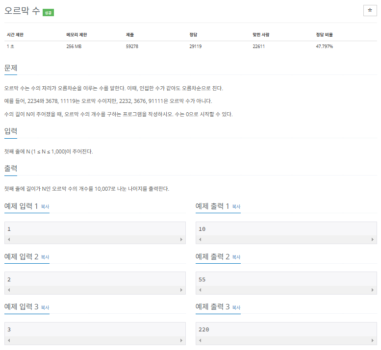 0부터 9까지의 숫자로 이루어진 오르막 수의 개수를 계산하는 문제임. 오르막 수는 각 자릿수가 이전 자릿수 이상인 수를 의미하며, n자리 오르막 수의 개수를 동적 계획법(DP)을 사용하여 계산함.