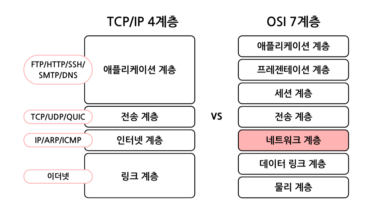- 네트워크 계층(Network Layer): 다양한 네트워크를 거쳐 패킷을 전송하는 기능을 제공함. IP 주소를 이용한 라우팅이 이 계층에서 이루어짐.
