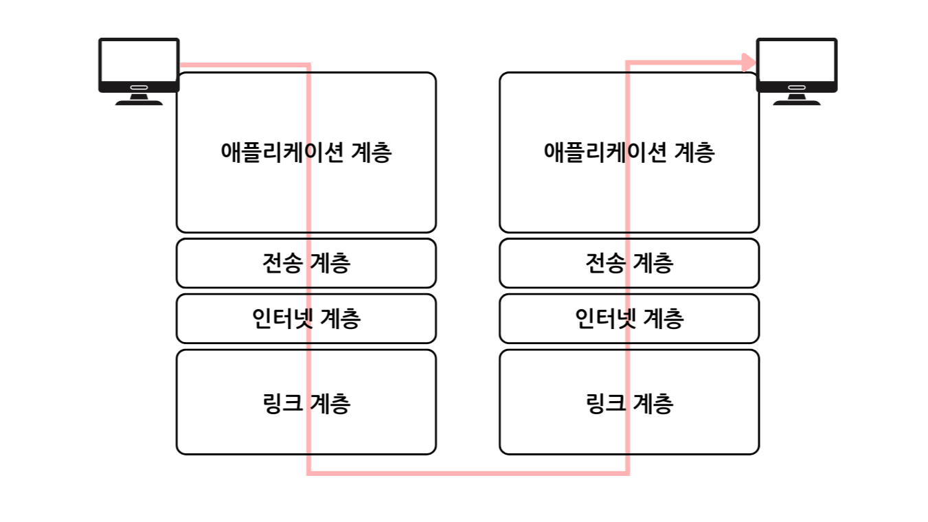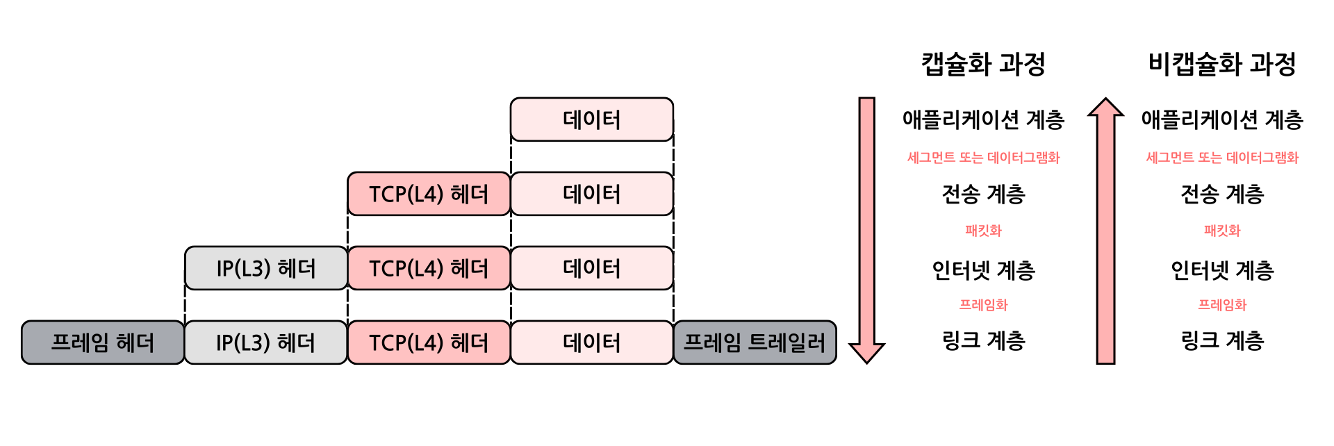 - 애플리케이션 계층에서 전송 계층으로 사용자가 보내는 요청(request) 값 들이 캡슐화 과정을 거쳐 전달됨