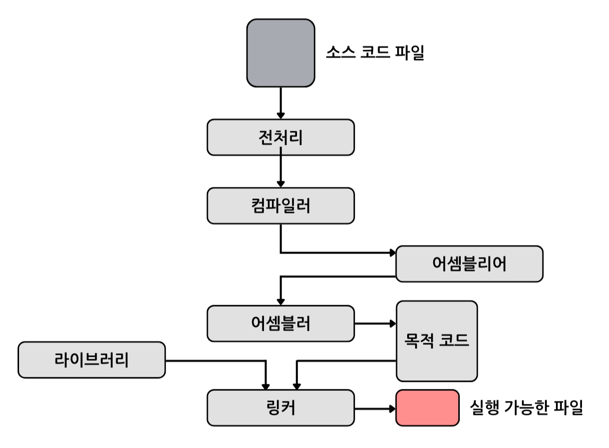 - 전처리: 소스 코드의 주석을 제거하고 #include 등 헤더 파일을 병합하여 매크로를 치환함.
