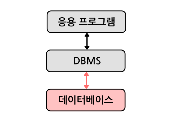 - 데이터베이스 위에 DBMS가 있고, 그 위에 응용 프로그램이 있는 구조로 데이터를 주고 받음.