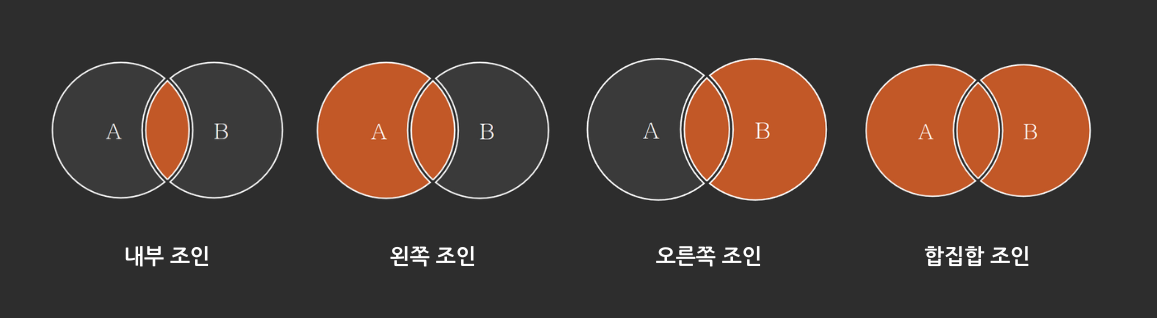 - 내부 조인(inner join): 왼쪽 테이블과 오른쪽 테이블의 두 행이 모두 일치하는 행