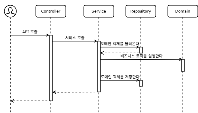 - 비즈니스 로직이 처리되는 주(main) 영역은 서비스 컴포넌트가 아닌 도메인 모델이어야 함. 서비스는 도메인을 불러와서 도메인에 일을 시키는 정도의 역할만 해야 함.