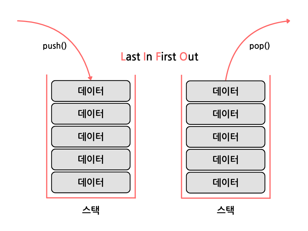- 스택(stack): 가장 마지막으로 들어간 데이터가 가장 첫 번째로 나오는 성질(LIFO: Last In First Out)을 가진 자료 구조