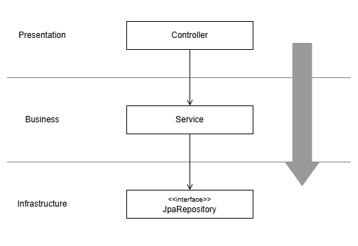 - 인프라스트럭처 레이어에 위치한 JPA 코드를 수정한다면, 변경에 다른 영향 범위는 프레젠테이션 레이어와 애플리케이션 레이어임. 인프라스트럭처 레이어의 구성이 달라져도 애플리케이션 레이어가 영향을 받지 않는 구조로 애플리케이션을 설계해야 함. → 의존성 역전 사용