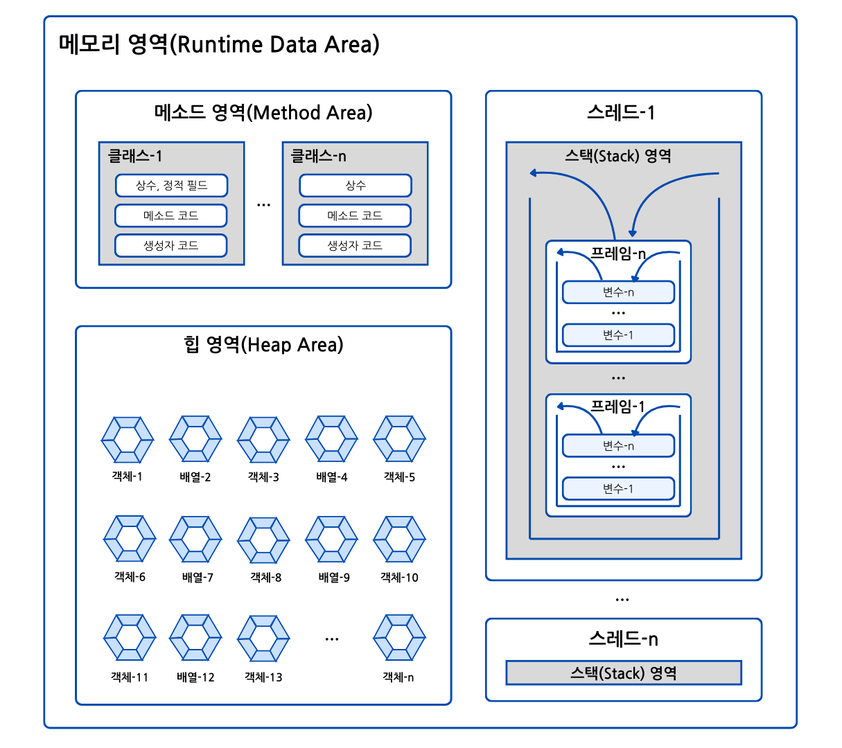 - 힙(Heap) 영역: 객체가 생성되는 영역.