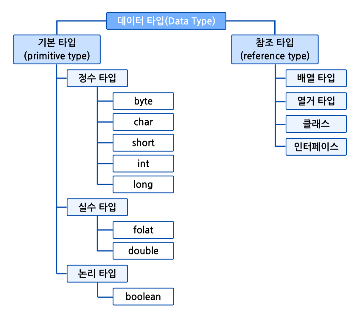 - 자바의 데이터 타입은 기본 타입(primitive type)와 참조 타입(reference type)로 분류됨.