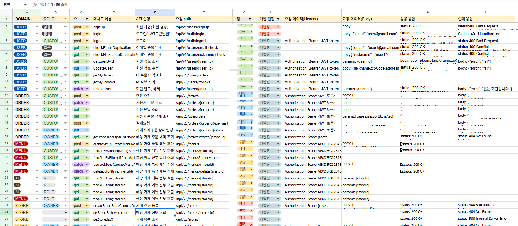 API 명세서는 내가 맡았던 가게 API를 store가 아닌 orders쪽으로 변경하는 것 외에는 구글 스프레드시트 양식을 체계적으로 잘 구성했다고 칭찬을 들었다.
