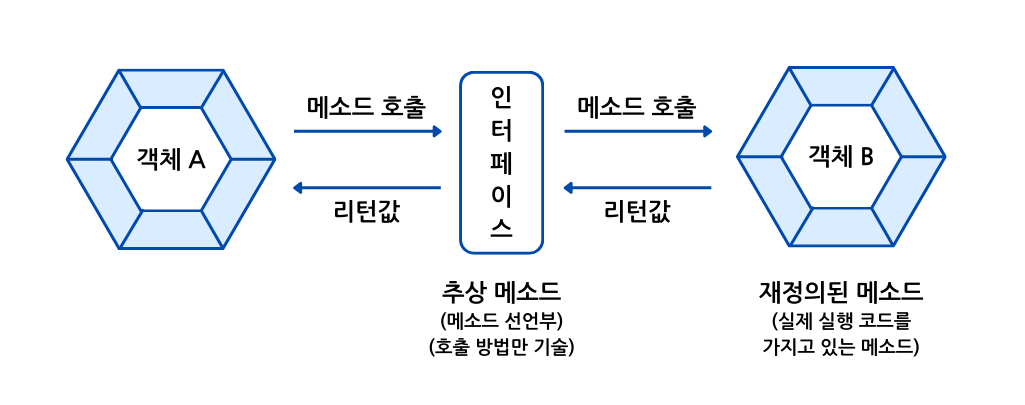 - 추상 메소드는 객체가 인터페이스를 통해 어떻게 메소드를 호출할 수 있는지 방법을 알려줌. 인터페이스 구현 객체는 메소드의 실행부를 갖는 재정의된 메소드가 있어야 함.