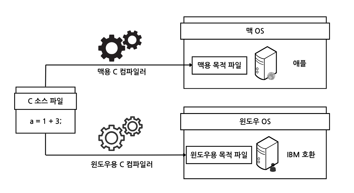 | 비고 | 기종별 어셈블러 필요 | 기종별 컴파일러 필요 | 단 하나의 컴파일러만 필요 기종별 JRE 세팅 필요(한 번만 설치해주면 됨) |