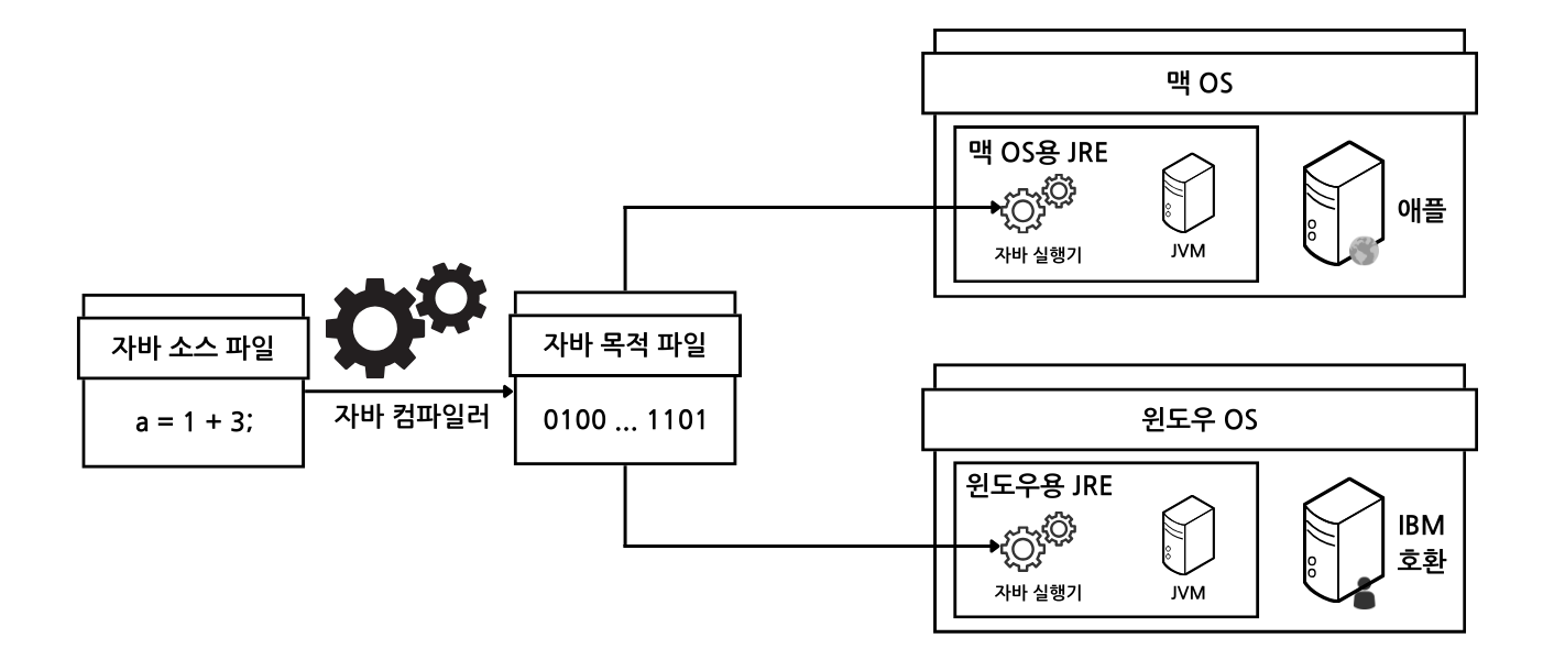 - 자바는 가상 머신(Virtual Machine)으로 인간을 이롭게 했다. 컴파일러를 기종별로 따로 구매하지 않아도 된다. 또한, 자바 컴파일러는 무료다.