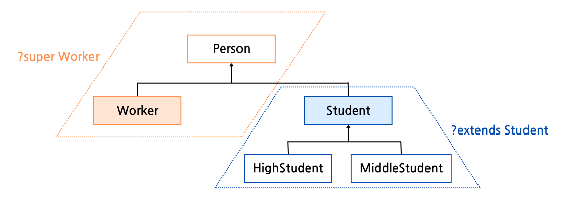 리턴타입 메소드명(제네릭타입<? super Worker> 변수) { ... }