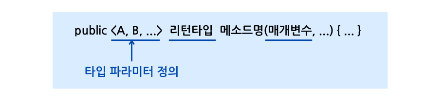 - 제네릭 메소드는 리턴 타입 앞에 <> 기호를 추가하고 타입 파라미터를 정의한 뒤, 리턴 타입과 매개변수 타입에서 사용한다.\