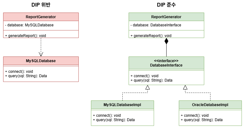 - ReportGenerator는 구체적인 데이터베이스 구현이 아닌 DatabaseInterface 추상화에 의존한다.