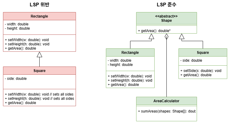 - Rectangle의 예상 동작을 위반하므로, Square를 Rectangle 대신 사용할 경우 프로그램 동작에 오류가 발생한다.