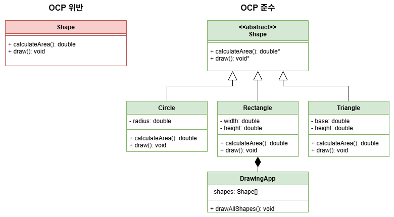 - 새로운 도형 유형을 추가할 때 기존 코드를 수정할 필요 없이 새로운 클래스만 추가하면 된다.