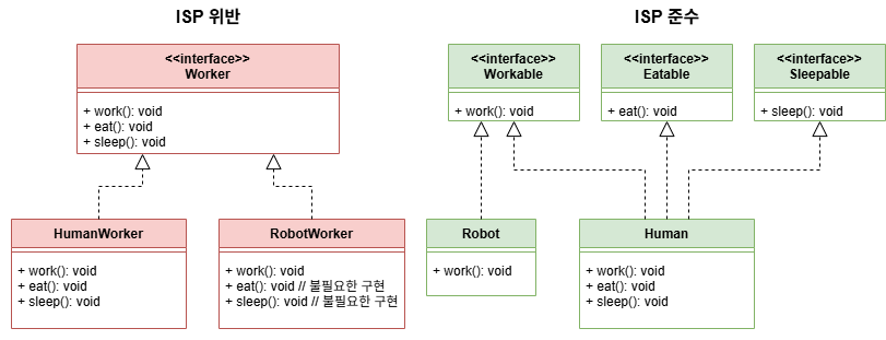 - HumanWorker는 모든 메서드를 자연스럽게 구현할 수 있지만, RobotWorker는 eat()와 sleep()이 불필요한 구현을 해야 한다.