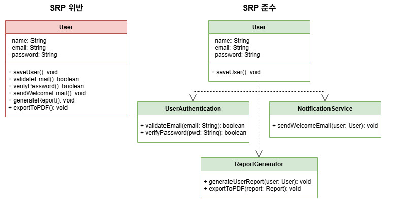 - User 클래스가 사용자 데이터 관리, 인증, 이메일 전송, 보고서 생성 등 여러 책임을 한꺼번에 담당한다.