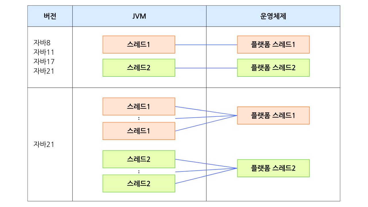 - 자바 17까지: 운영체제가 제공하는 플랫폼(platform) 스레드를 래핑했기 때문에 스레드와 플랫폼 스레드가 1:1로 매핑된다.