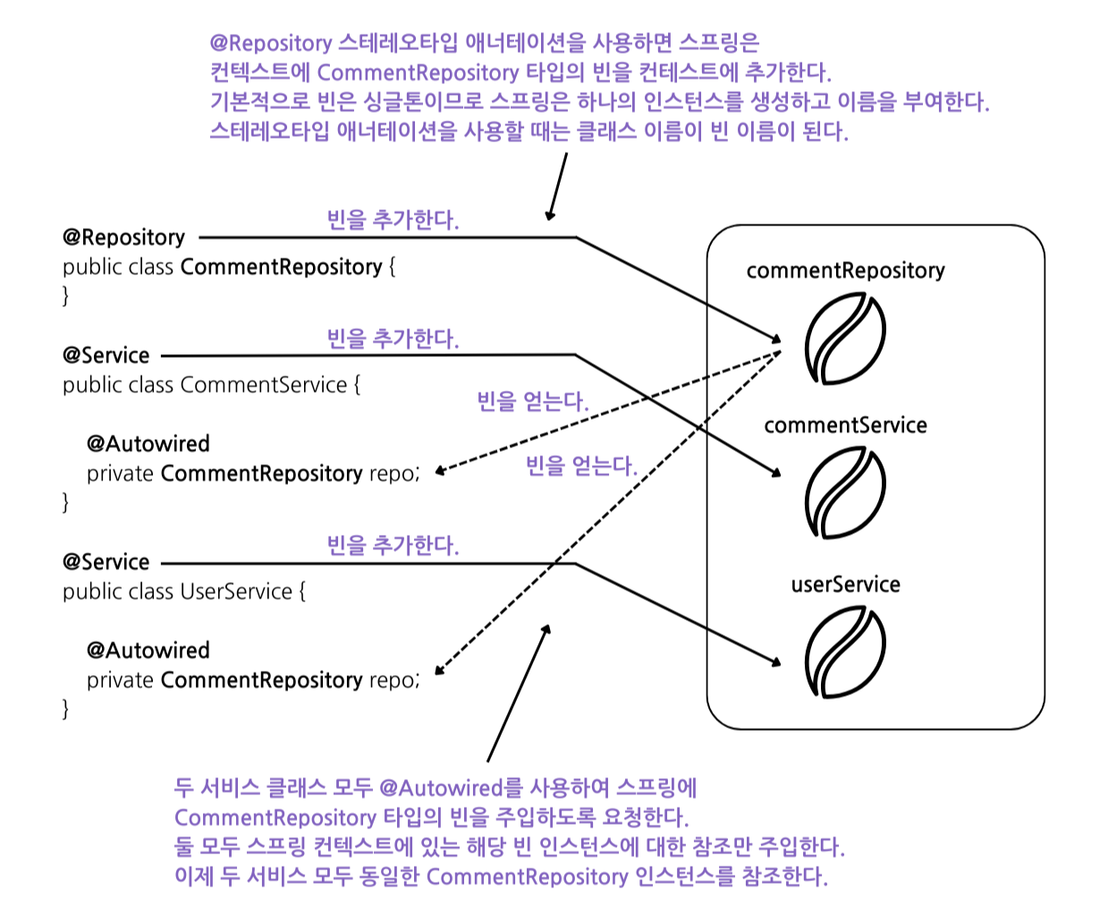 var service = c.getBean(CommentService.class); // 이 코드 줄에서 스프링은 CommentService 빈의 참조 값을 제공해야 함. 이때 빈 인스턴스도 생성함.