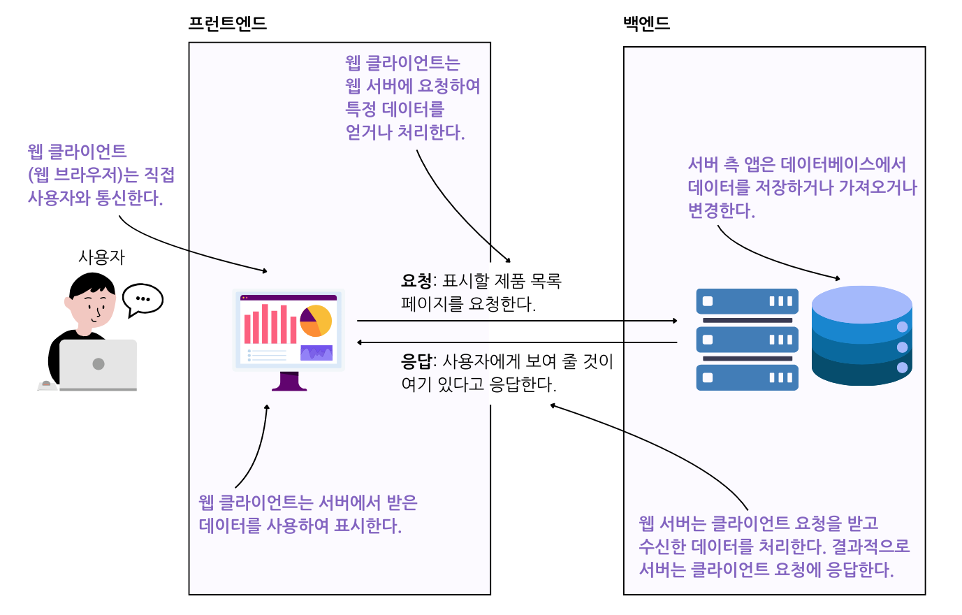 - 백엔드는 HTML, CSS, 이미지 등 웹 브라우저가 해석하고 표시할 수 있는 형식의 데이터로 응답한다.