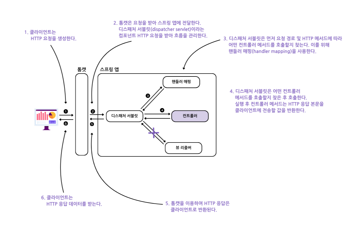 - 컨트롤러 클래스에 @Controller 스테레오타입 애너테이션을 추가한다. 스프링 컨텍스트에서 클래스의 인스턴스가 빈이 되고 스프링 MVC는 이 애너테이션이 메서드를 특정 HTTP 경로에 매핑하는 컨트롤러라고 인식한다.